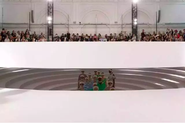 Anya Hindmarch 的最新系列命名为 Circulus,拉丁语中的"圆",很直接、很纯粹。螺旋、圆与几何形是本季的重要构成元素。大秀现场,巨型白色圆盘悬在链上,圆盘上升后,呈罗马剧场状圆形凹陷的主秀场跃然眼前。